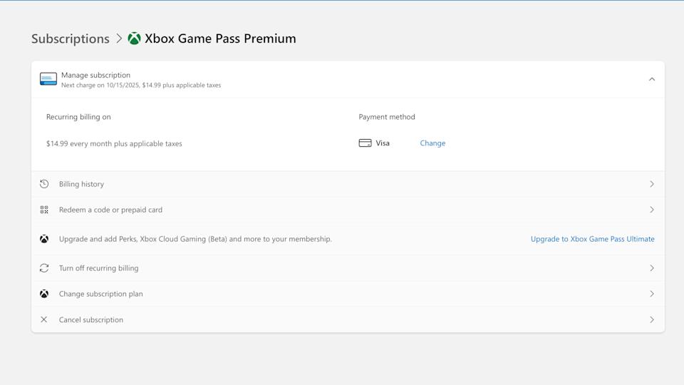 আপনি যদি প্রতি মাসে 15 ডলারে গেম পাস প্রিমিয়াম বা প্রতি মাসে 10 ডলারে প্রয়োজনীয় গেম পাসের মতো আরও সাশ্রয়ী সাবস্ক্রিপশনে স্যুইচ করতে পছন্দ করেন তবে প্রক্রিয়াটি প্রায় একই।