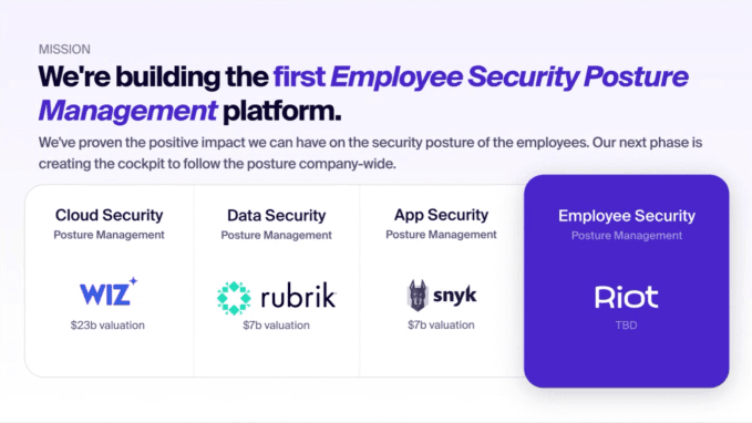 ফরাসি স্টার্টআপ দাঙ্গা ২০২৪ সালে বার্ষিক রাজস্বতে million ১০ মিলিয়ন ডলারে পৌঁছানোর পরে $ ৩০ মিলিয়ন ডলার সিরিজ বি রাউন্ড উত্থাপন করেছে। মূলত সাইবারসিকিউরিটি ঝুঁকি সম্পর্কে কর্মীদের শিক্ষিত করার দিকে মনোনিবেশ করা হয়েছে, সংস্থাটি এখন আরও একধাপ এগিয়ে যেতে এবং কর্মীদের ন্যাজ করতে চায় যাতে তারা তাদের আক্রমণ পৃষ্ঠকে হ্রাস করতে পারে।