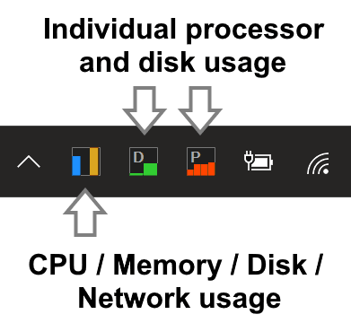 ওপেন সোর্স সরঞ্জামটি উইন্ডোজ টাস্কবারে বেশ কয়েকটি আইকন যুক্ত করে যা নির্দিষ্ট হার্ডওয়্যার উপাদানগুলির ব্যবহার কল্পনা করে। আপনি ইনস্টলেশনের পরে সিপিইউ, মেমরি, ডিস্ক এবং নেটওয়ার্ক ব্যবহার দেখতে পান।