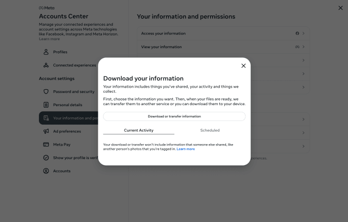 এই পদক্ষেপগুলির যে কোনও একটি আপনাকে নিয়ে যাবে আপনার তথ্য ডাউনলোড করুন পৃষ্ঠা। আপনি যে প্রোফাইলগুলি থেকে আপনার তথ্য ডাউনলোড করতে চান সেগুলি ক্লিক করতে হবে এবং আপনি যদি এটি কোনও ডিভাইসে ডাউনলোড করতে চান বা সরাসরি অন্য গন্তব্যে তথ্য স্থানান্তর করতে চান তা চয়ন করতে হবে।